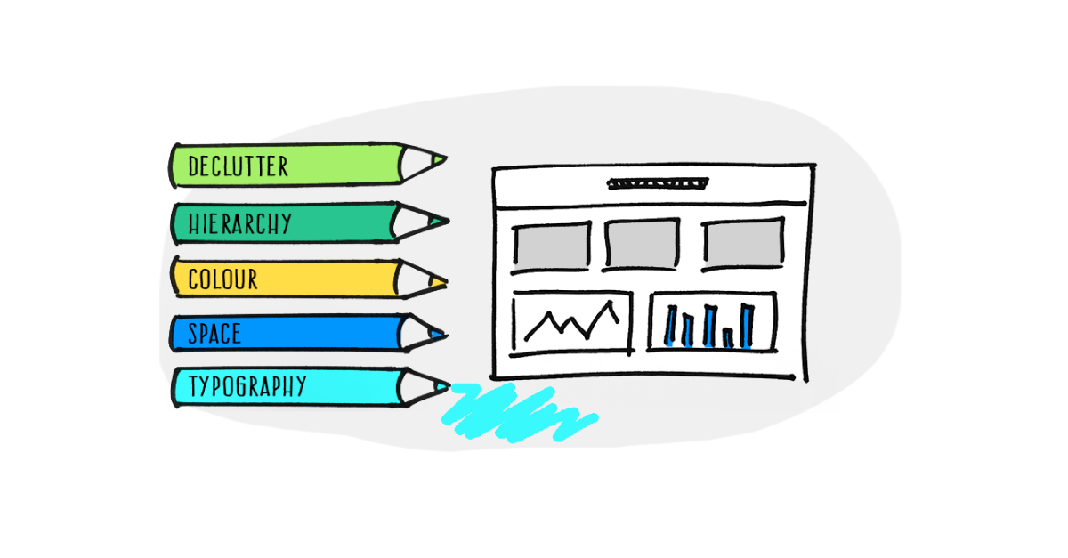 Generally, it’s better to reserve your colours for the data viz, charts and navigation items and keep the rest of the design fairly neutral. If your design is full of colour, whilst it may look fun and exciting, users will have to decipher your use of colour and see through all of the visual noise to get to what they really need – the information.