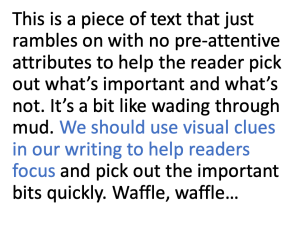 Use preattentive attributes (visual clues) to make things stand out such as bold text, size, italics, case and typeface, and colour. Make sure you apply them sparingly to achieve contrast. They'll help you build your information hierarchy by signalling to the user what they should pay attention to next, and so on… The following examples show a piece of text with no pre-attentive attributes, followed by the same text with colour applied, and then again with size: