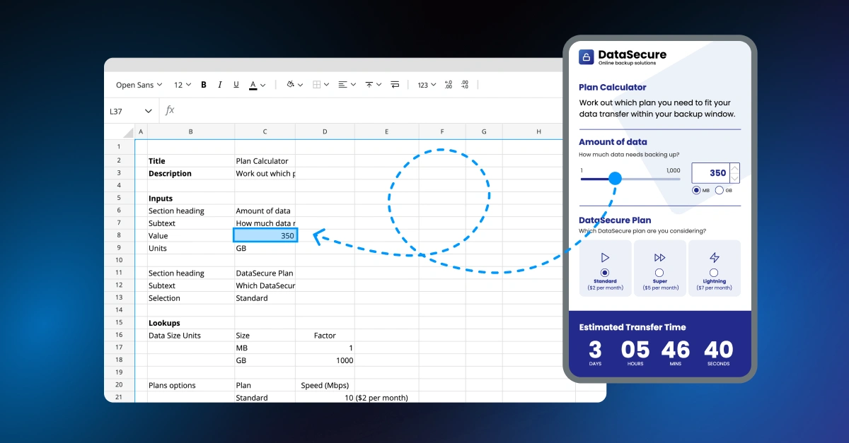 Pricing tools, ROI calculators, quote builders, financial models. These are logic-heavy outputs that analysts and consultants build constantly — usually in spreadsheets. A no-code platform turns that same logic into a polished, shareable tool that anyone can use without seeing the underlying model.
