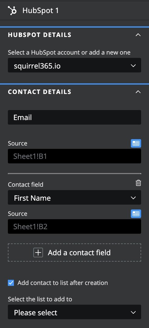 Those on a Builder plan will have access to the new HubSpot connector, which lets you create a contact in HubSpot directly – without the need for Zapier. Perfect for adding lead capture to your projects. Build up the list of contact fields that you want to send to HubSpot by clicking the Add a contact field button. Select which contact field to and bind it to a source cell in your spreadsheet.